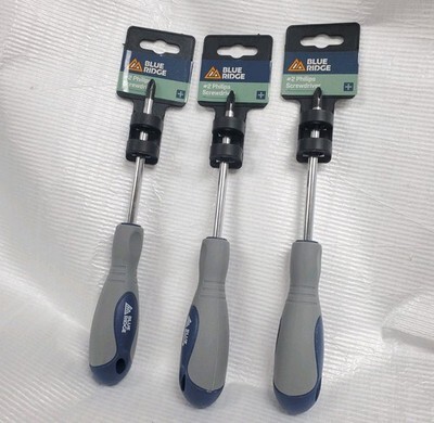 The Blue Ridge set of 3 tools (All same size) includes 2 x 4" Phillips screwdrivers made of steel and plastic. These screwdrivers are durable and reliable, perfect for various home and workshop projects. The blue color adds a pop of color to your tool collection, while the Phillips drive type ensures a secure grip on screws. Backed by a 1-year manufacturer warranty, these screwdrivers are a valuable addition to any toolbox.