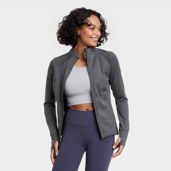 This jacket features soft curves that contour to the shape of your body to move with you as you stretch and flow. A full-length zipper offers as much coverage as you like, and it's concealed by a zipper garage for comfortable wear. Thumbholes keep the sleeves in place and keep your hands warm, and the stretchy knit fabric lends a soft, smooth feel for year-round wear. Secure side-entry pockets provide safe storage and maintain a sleek shape when closed.