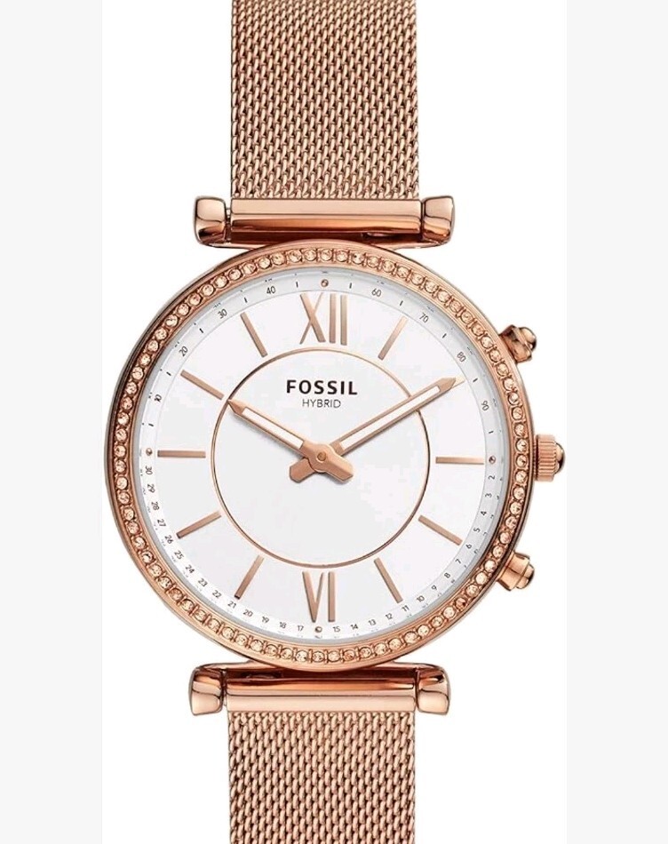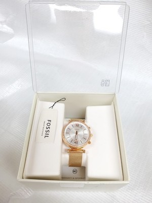 The Fossil Hybrid Smartwatch Carlie in Rose Gold-Tone Stainless Steel is a stylish and elegant wristwatch designed specifically for women. This round watch features a rose gold dial color and matching stainless steel band color, creating a cohesive and sophisticated look. With its analog display and scratch-resistant case material, this watch is both functional and durable. Additionally, it comes with original box/packaging and papers, making it a perfect gift for any occasion. The Fossil brand name ensures high quality and a timeless design that is sure to complement any outfit.