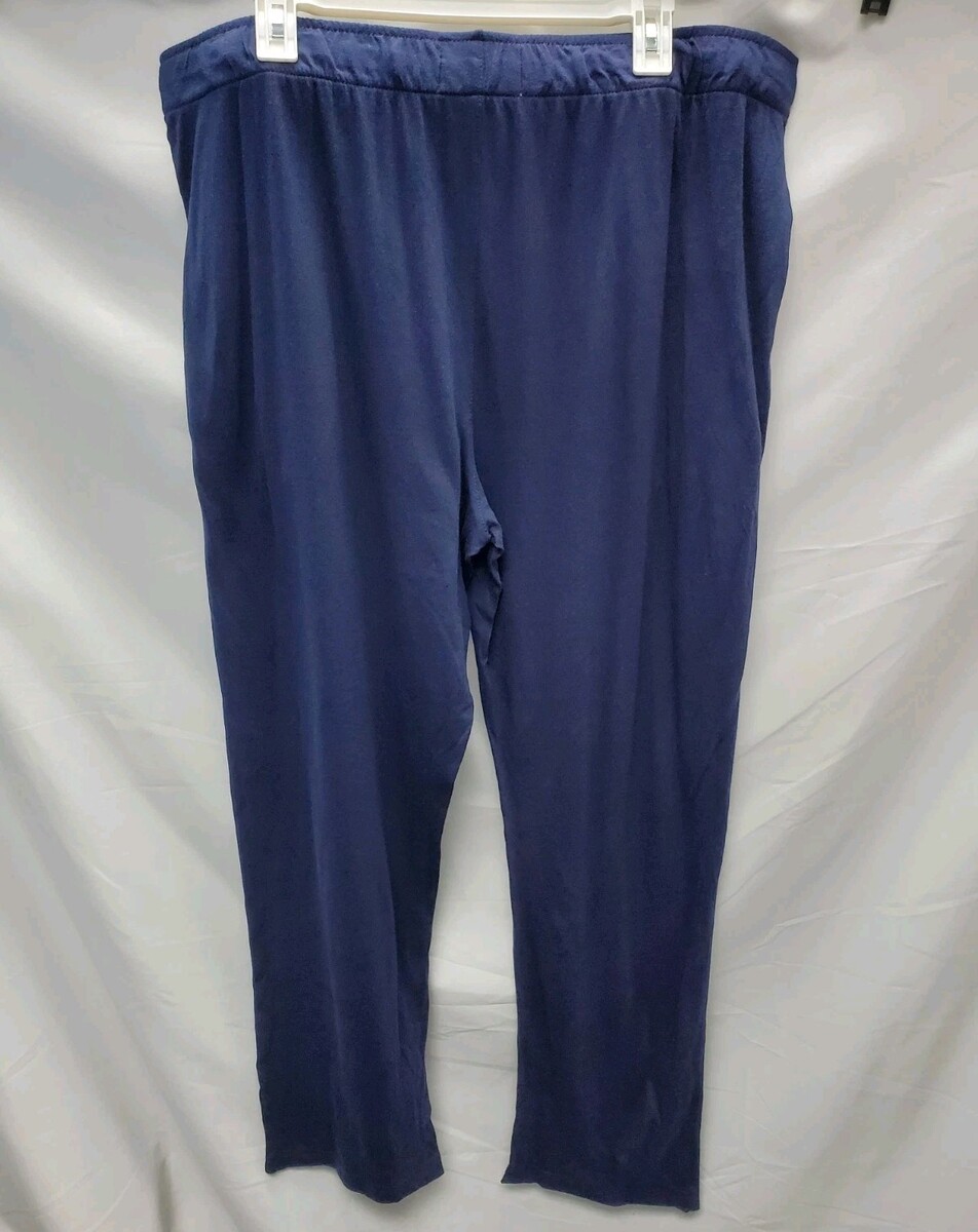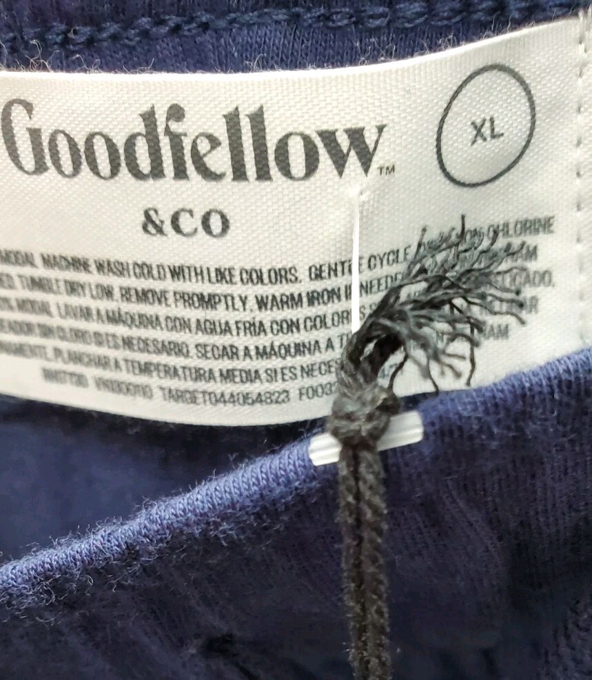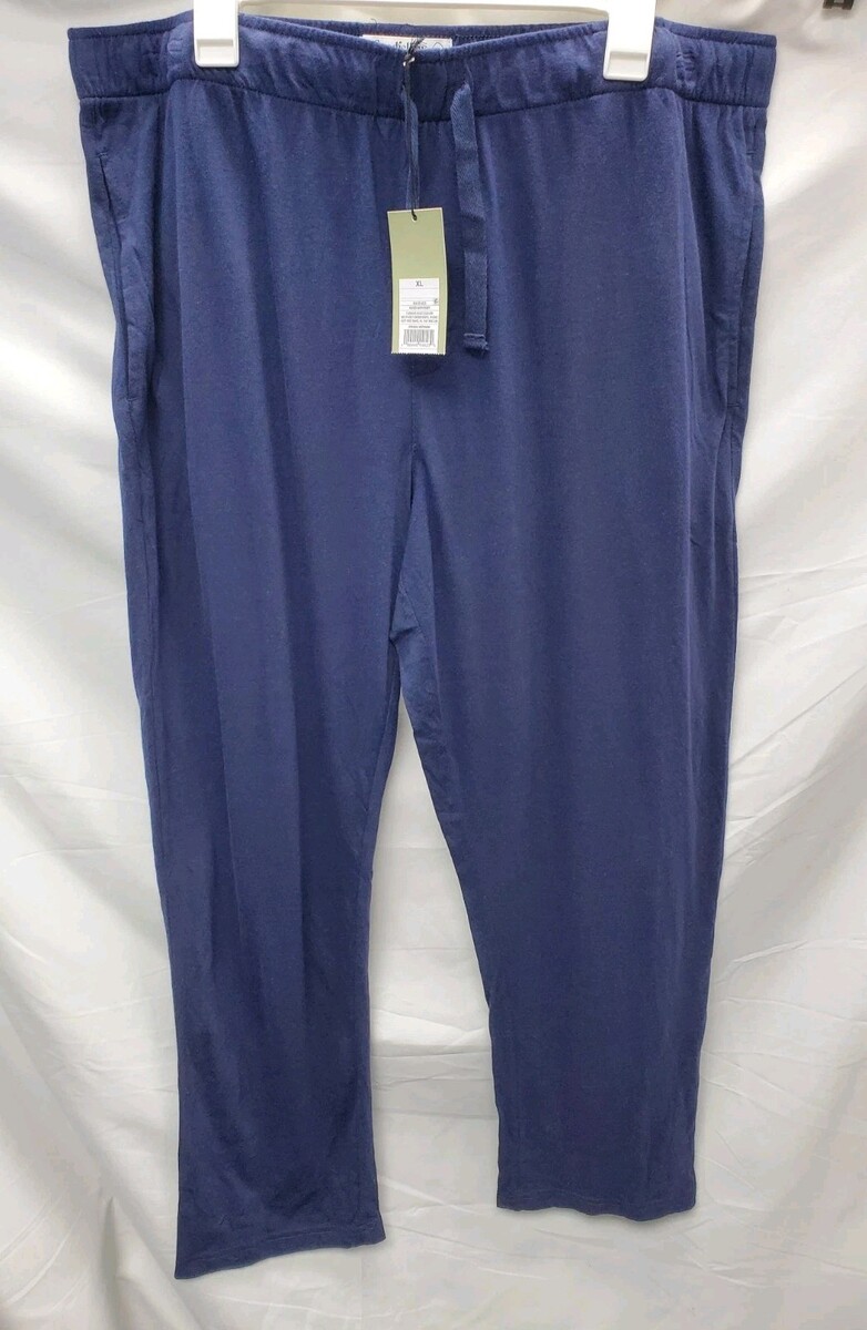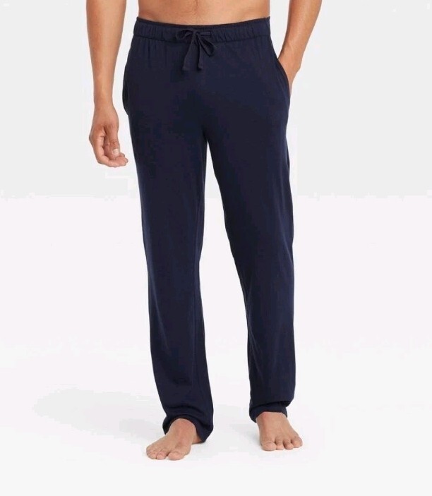 The product is a pair of men's XL 32" knit pajama pants in Xavier Navy by Goodfellow & Co. These solid dark blue pants feature a drawstring closure for a comfortable fit. Made from a blend of cotton and modal, they are machine washable for easy care. The relaxed theme makes them perfect for lounging or sleeping.