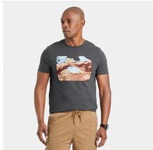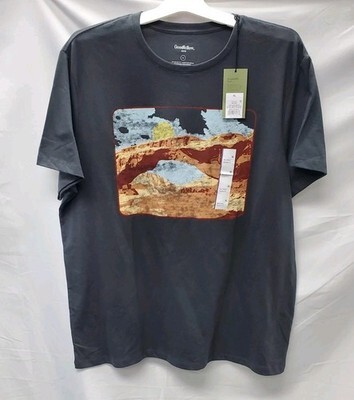 The Goodfellow Men's XL Landscape Print Short Sleeve Graphic T-Shirt in Charcoal is a stylish and versatile addition to any man's wardrobe. Made from a blend of polyester and cotton, this lightweight t-shirt features a crew neckline and short sleeves, making it suitable for all seasons. With a regular fit and tagless design, it ensures comfort and breathability for outdoor activities or casual everyday wear. The graphic print adds a unique touch, perfect for those who appreciate a more laid-back yet trendy style. Easy to care for with machine washable instructions, this t-shirt is a practical and fashionable choice for any man looking for a quality basic tee.