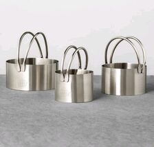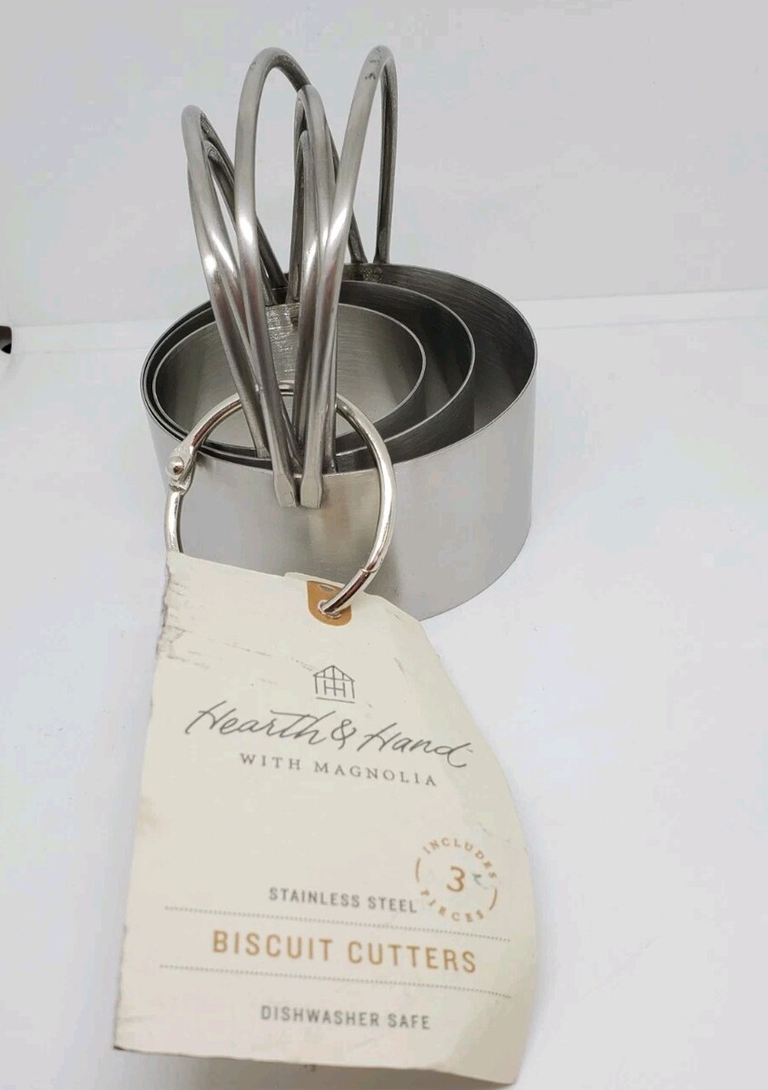 The Hearth & Hand with Magnolia 3 Pc. Stainless Steel Biscuit Cutters are a versatile set that includes three different sizes for small, medium, and large biscuits. Made from durable stainless steel, these round cutters feature a sleek silver color and stand at 3.5 inches tall. Perfect for all occasions, this set is a must-have for any home baker looking to add a touch of elegance to their baked goods. Made by Hearth & Home, this biscuit cutter set is sure to bring a touch of charm to your kitchen.