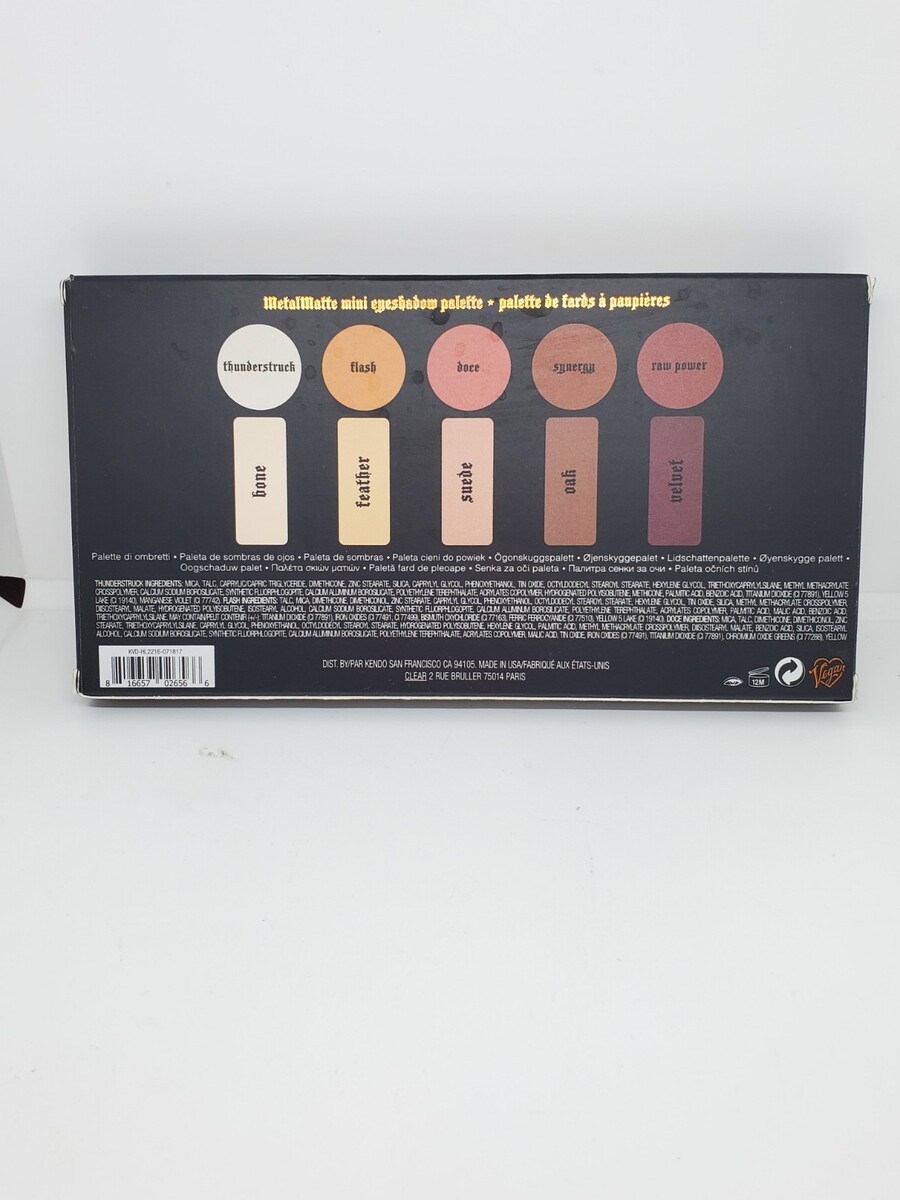 Kat Von D MetalMatte Mini Eyeshadow Palette, a limited-edition, travel-sized version of the brand's popular MetalMatte palette. Released in late 2017, this palette features 10 shades in a mix of metallic and matte finishes.