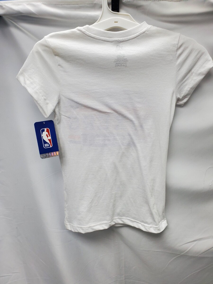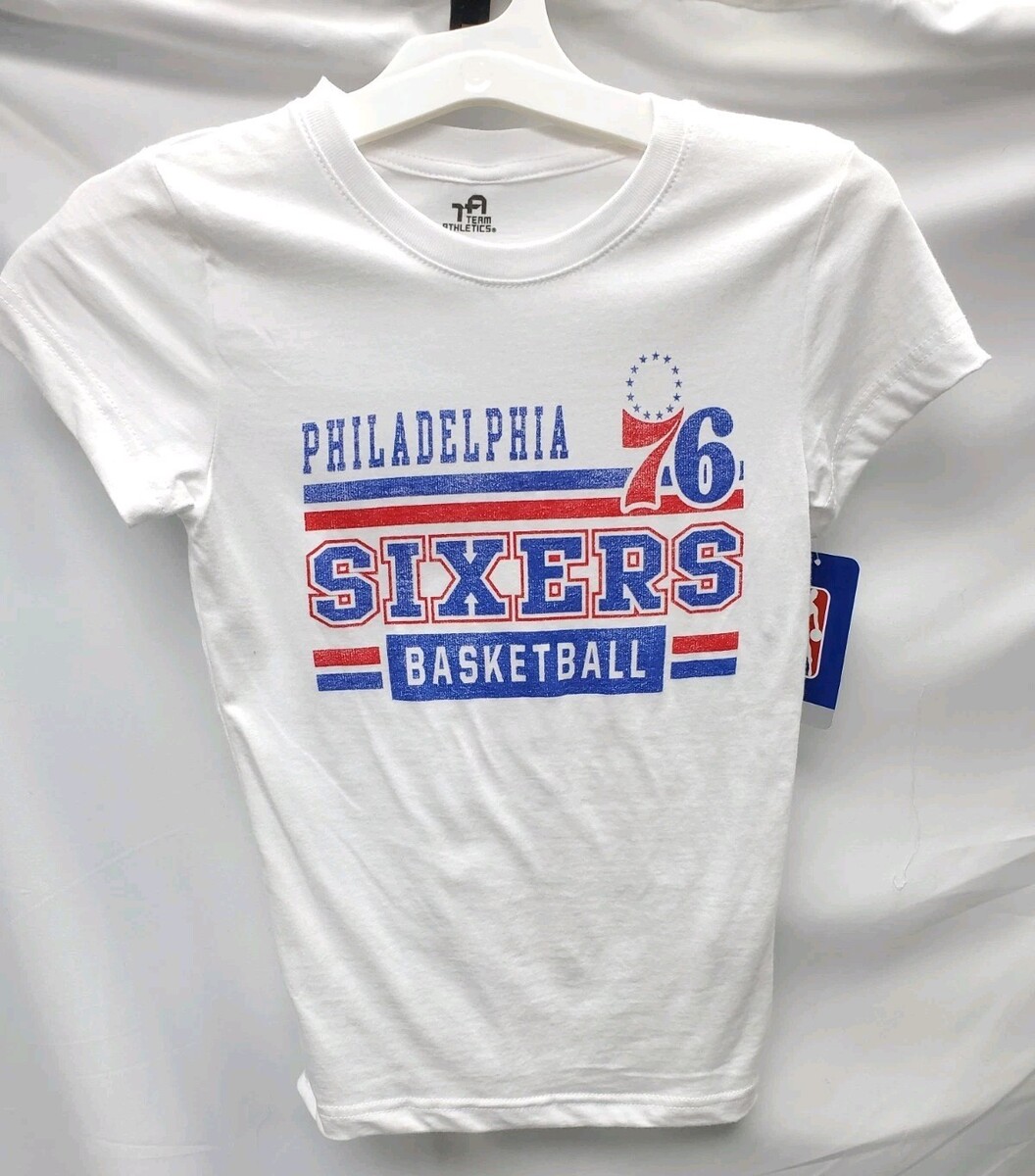 The product is a Team Athletics NBA Philadelphia 76ers girls' size medium white t-shirt. This shirt is perfect for young fans of the Philadelphia 76ers basketball team, featuring the team's logo and colors. Made from comfortable cotton material, this shirt is ideal for showing support for the team during games or casual outings. The shirt is officially licensed by the National Basketball Association (NBA), making it a must-have for any basketball enthusiast.