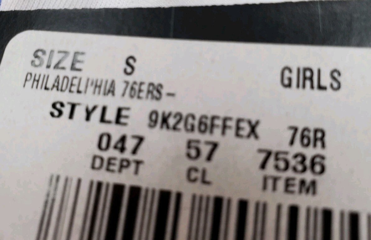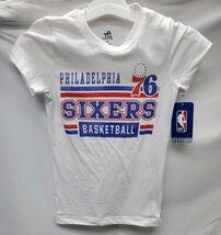 The product is a Team Athletics NBA Philadelphia 76ers girls' size small white t-shirt. This shirt is perfect for young fans of the Philadelphia 76ers basketball team, featuring the team's logo and colors. Made from comfortable cotton material, this shirt is ideal for showing support for the team during games or casual outings. The shirt is officially licensed by the National Basketball Association (NBA), making it a must-have for any basketball enthusiast.