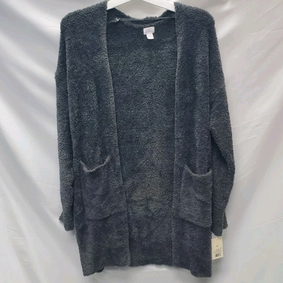 The Stars Above Cozy Women's Lounge Cardigan in size M/L is perfect for lounging in style. Made from soft polyester yarn in a solid charcoal gray color, this long sleeve cardigan features an open neckline and convenient pockets. Ideal for any occasion, this cozy cardigan is machine washable and features a cozy theme, making it a versatile and comfortable addition to any woman's wardrobe. Perfect for the winter, fall, or spring seasons, this cardigan by Stars Above is sure to become a staple in your loungewear collection.