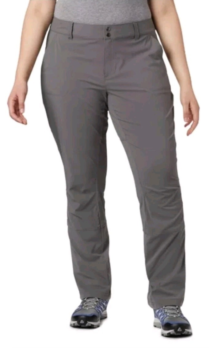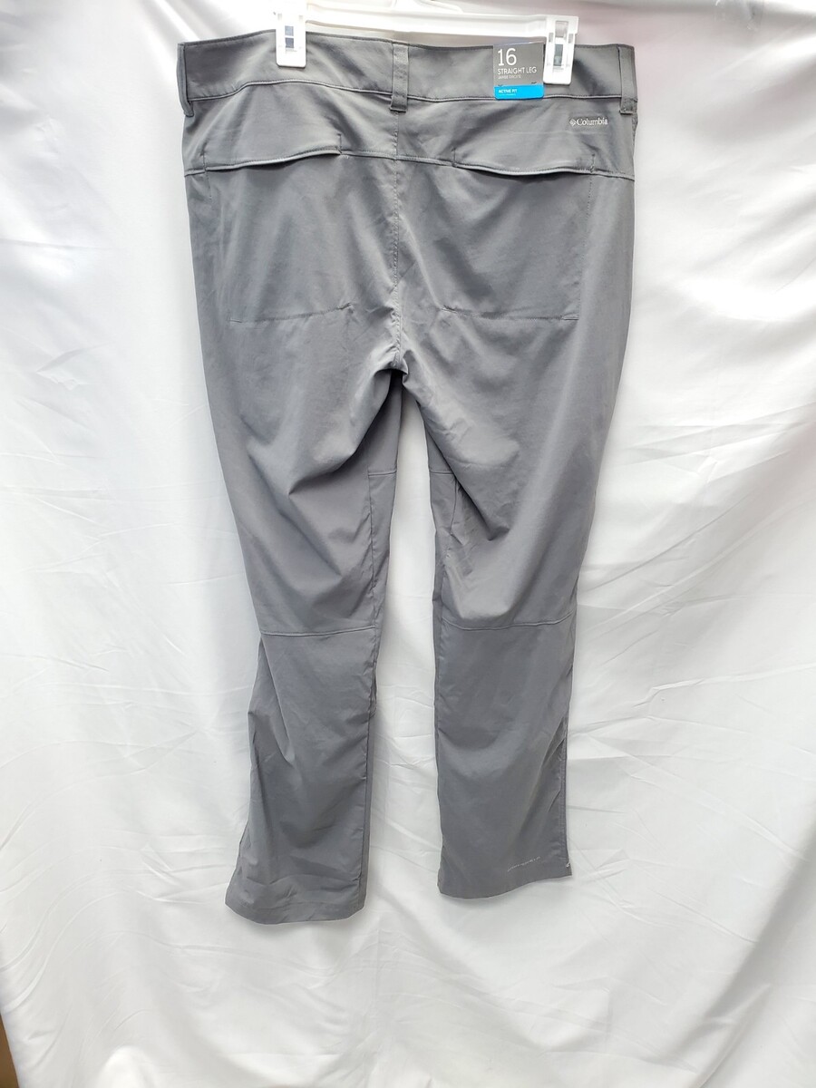 The product is a pair of women's Columbia Size 16 straight leg pants in a solid gray color. They are designed with an active fit and are made of nylon material, making them lightweight and stretchy. The pants have a flat front and a 33" inseam, suitable for casual, workwear, and travel occasions during the seasons of summer, fall, and spring. Additionally, they feature pockets and can be cuffable for a comfortable and stylish look. Easy to care for with machine washable instructions, these Columbia pants are a versatile and practical addition to any woman's wardrobe.